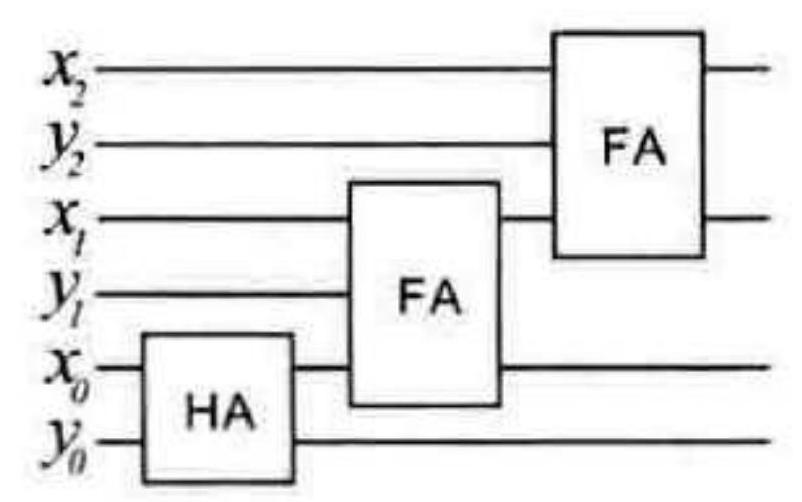 图 3-7 两个三比特整数 $x=x_{2} x_{1} x_{0}$ 和 $y=y_{2} y_{1} y_{0}$ 的加法电路,使用教给学龄儿童的基本算法 为了完成归纳,假设任意 $n$ 比特函数可以由电路计算,并且令 $f$ 是 $n+1$ 个比特上的函数。定义 $n$ 比特函数 $f_{0}$ 和 $f_{1}$ 为 $f_{0}\left(x_{1}, \cdots, x_{n}\right) \equiv f\left(0, x_{1}, \cdots, x_{n}\right)$ 和 $f_{1}\left(x_{1}, \cdots, x_{n}\right) \equiv f\left(1, x_{1}, \cdots, x_{n}\right)$ 。它们都是 $n$ 比特函数,因此根据归纳假设,存在计算这些函数的电路。