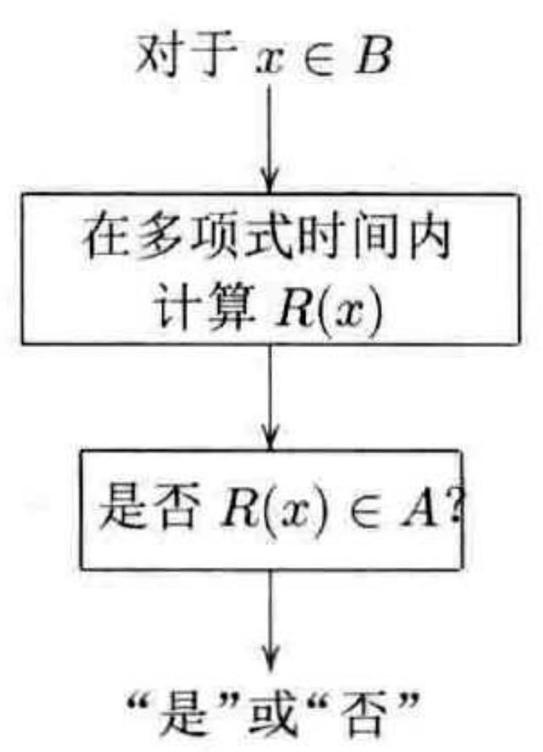 图灵机在多项式时间内可以通过给定输人 $x$ 得到输出 $R(x)$ ,其中 $x \in B$ 当且仅当 $R(x) \in A$ 。因此,如果我们有一个判定 $A$ 的算法,我们只需要进行一点点额外的计算就可以判定 $B$ 。在这种意义下,语言 $B$ 的判定本质上不会比 $A$ 难。