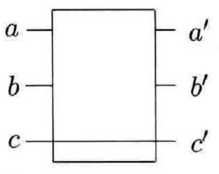 上述台球计算机为实现被称为 Fredkin 门的可逆通用逻辑门提供了一种优雅的方法。的确, Fredkin 门的特性提供了可逆逻辑门和电路的一般原理的有益概述。Fredkin 门有三个输入比特和三个输出比特,我们分别用 $a, b, c$ 和 $a^{\prime}, b^{\prime}, c^{\prime}$ 来表示。比特 $c$ 是一个控制比特,其值在 Fredkin 门作用后不会发生改变,即 $c^{\prime}=c 。 c$ 被称为控制比特的原因是它控制着其他两个比特 $a$ 和 $b$ 的改变。如果 $c$ 的值是 0 ,则 $a$ 和 $b$ 不变,即 $a^{\prime}=a, b^{\prime}=b$ 。如果 $c$ 的值是 1 ,则 $a$ 和 $b$ 进行交换,即 $a^{\prime}=b, b^{\prime}=a$ 。图 3-15 展示了 Fredkin 门的真值表。很容易看出 Fredkin 门是可逆的,因为给定了输出 $a^{\prime}, b^{\prime}, c^{\prime}$ ,我们可以确定输人 $a, b, c_{\circ}$ 事实上,为了恢复原始的输人,我们只需要在 $a^{\prime}, b^{\prime}, c^{\prime}$上作用另一个 Fredkin 门。