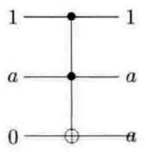Toffoli 门还可以被用来实现扇出操作:第一个控制位作为辅助比特初始时置为 1 ,将 $a$ 赋值给第二个控制位,则最后输出 $1, a, a$ 。详见图 3-19。之前我们已经讲过与非门和扇出门合在一起构成一组通用门,因此我们可以得出结论,任一电路可以被一个只包含 Toffoli 门和辅助比特的可逆电路高效模拟。可以使用与 Toffoli 门相同的方法实现诸如还原计算之类的有用的附加技术。