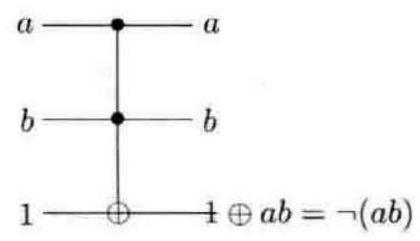 图 3-18 通过 Toffoli 门实现与非门。顶端的两个比特代表了与非门的输人,第三个比特作为辅助比特,初始时置为 1 。与非门的输出在第三个比特上