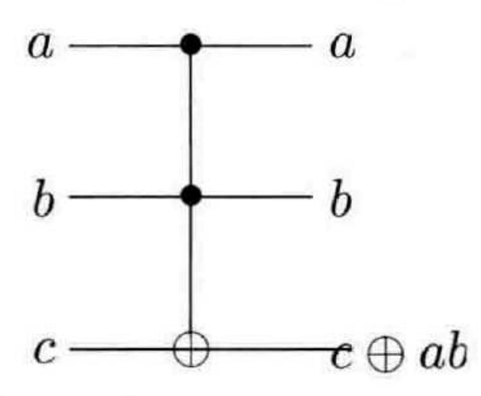 Toffoli 门有三个输人比特 $a, b$ 和 $c$ 。 $a$ 和 $b$ 被称为第一和第二控制位,而 $c$ 是目标位。该门保持两个控制位不变,如果两个控制位都是 1 则翻转目标位,否则目标位也不变。Toffoli 门的真值表和电路表示如图 3-17 所示。