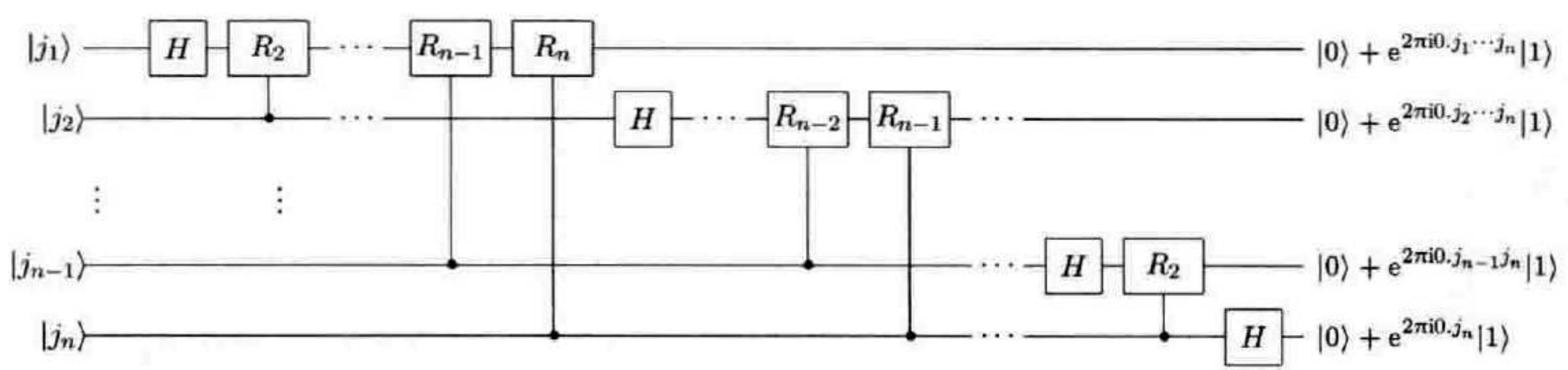 基。我们需要把状态 $|j\rangle$ 写成二进制形式 $j=j_{1} j_{2} \cdots j_{n}$ 。更正式地,$j=j_{1} 2^{n-1}+j_{2} 2^{n-2}+\cdots+j_{n} 2^{0}$ 。方便起见,我们用记号 $0 . j_{l} j_{l+1} \cdots j_{m}$ 来表示二进制小数 $j_{l} / 2+j_{l+1} / 4+\cdots+j_{m} / 2^{m-l+1}$ 。