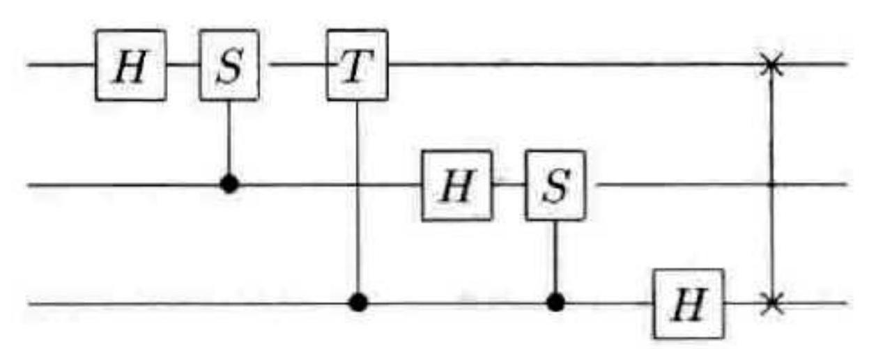 最后用交换操作(参考 1.3.4节给出的一个电路描述)来逆转量子比特的顺序,为清晰起见,图 5-1省略了这些交换。经过交换操作后,量子比特的状态变为