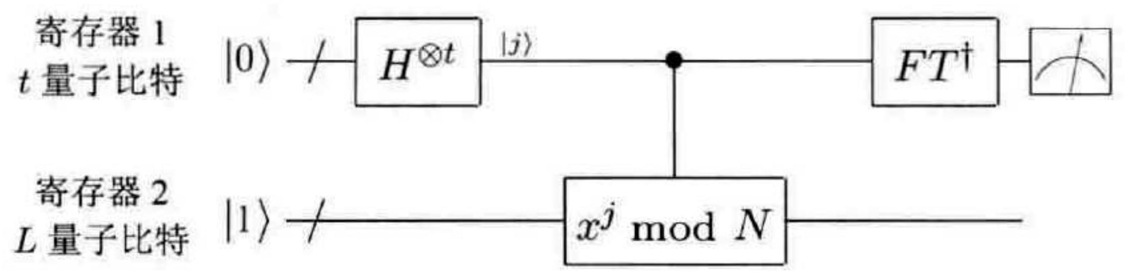 为什么这个算法是对的呢?一个理解它的方式是认识到式(5.63)是 $|f(x)\rangle$ 在 $\left\{0,1, \cdots, 2^{L}-1\right\}$上的傅里叶变换的一个近似(见习题 5.20 ),并且傅里叶变换具有专题 5.5 描述的有趣并且非常有用的位移不变性。另一种理解方式是,求阶算法做的事情是查找函数 $f(k)=x^{k} \bmod N$ 的周期,所以查找一般周期函数的周期的能力是不足为奇的。另外就是意识到黑盒 $U$ 可以自然地用某个特征向量恰好是 $|\hat{f}(\ell)\rangle$ 的西算子来实现,如习题 5.21 所示,这样就可以应用 5.2 节的相位估计过程来解决这个问题。