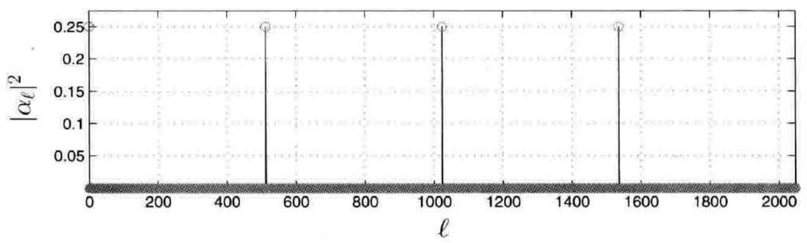 $$ \begin{equation*} p(|m-b| > e)=\sum_{-2^{t-1} < l \leqslant-(e+1)}\left|\alpha_{l}\right|^{2}+\sum_{e+1 \leqslant l \leqslant 2^{t-1}}\left|\alpha_{l}\right|^{2} \tag{5.27} \end{equation*} $$