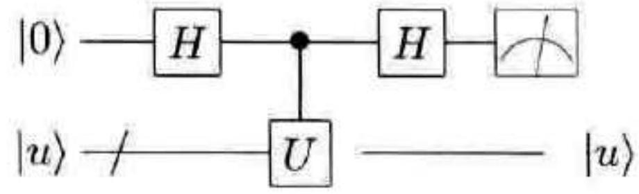 问题5.3(Kitaev 算法)考虑如下量子电路,其中 $|u\rangle$ 是 $U$ 的特征值 $\mathrm{e}^{2 \pi \mathrm{i} \varphi}$ 所对应的特征态。证明顶上的量子比特以 $p_{n} \equiv \cos {}^{2}(\pi \varphi)$ 的概率测得 0 。因为状态 $|u\rangle$ 不受电路影响,它可以重复使用。若用 $U^{k}$ 代替 $U$ ,其中 $k$ 是可控的任意整数,证明通过重复这个电路和适当增加 $k$ ,可以有效地获得所期望的 $p$ 的任意多比特,继而得到 $\varphi$ 的任意多比特,这是另外一种相位估计算法。