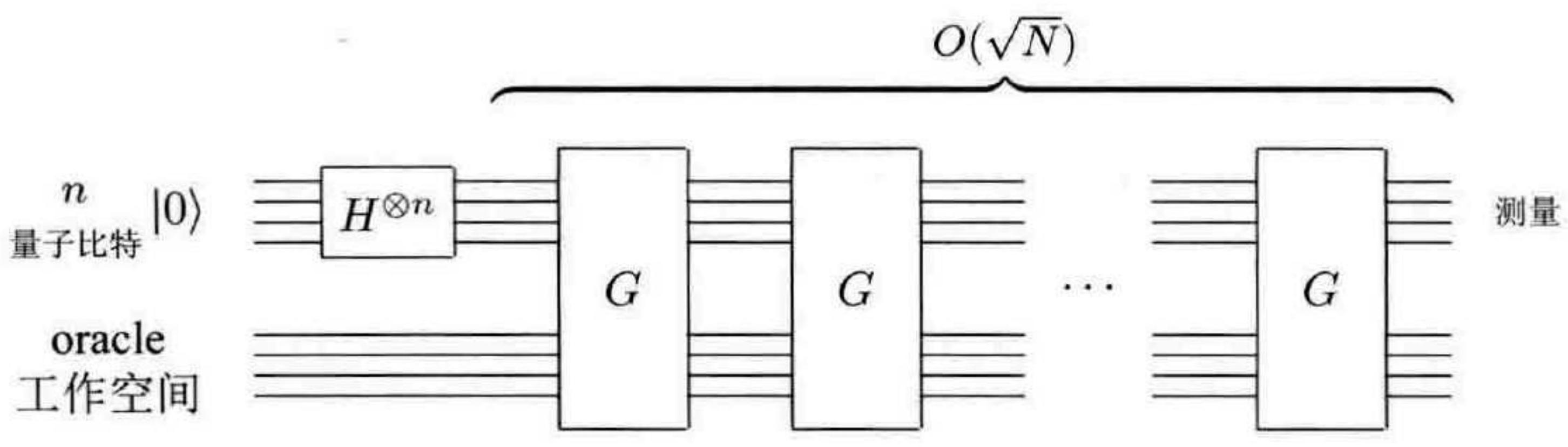 量子搜索算法:对于一个有 $N \equiv 2^{n}$ 个元素 $M$ 个解的搜索问题,制备状态 $\sum_{x}|x\rangle$ 然后重复 $G \equiv H^{\otimes n} U H^{\otimes n} O$ 共 $O(\sqrt{N / M})$ 次,其中 $O$ 是搜索 oracle,作用是:若 $|x\rangle$ 是一个解,则 $|x\rangle \rightarrow-|x\rangle$ ,否则不变,而 $U$ 使得 $|0\rangle \rightarrow-|0\rangle$ 但对其他计算基矢态不变。测量以高概率得到搜索问题的一个解。