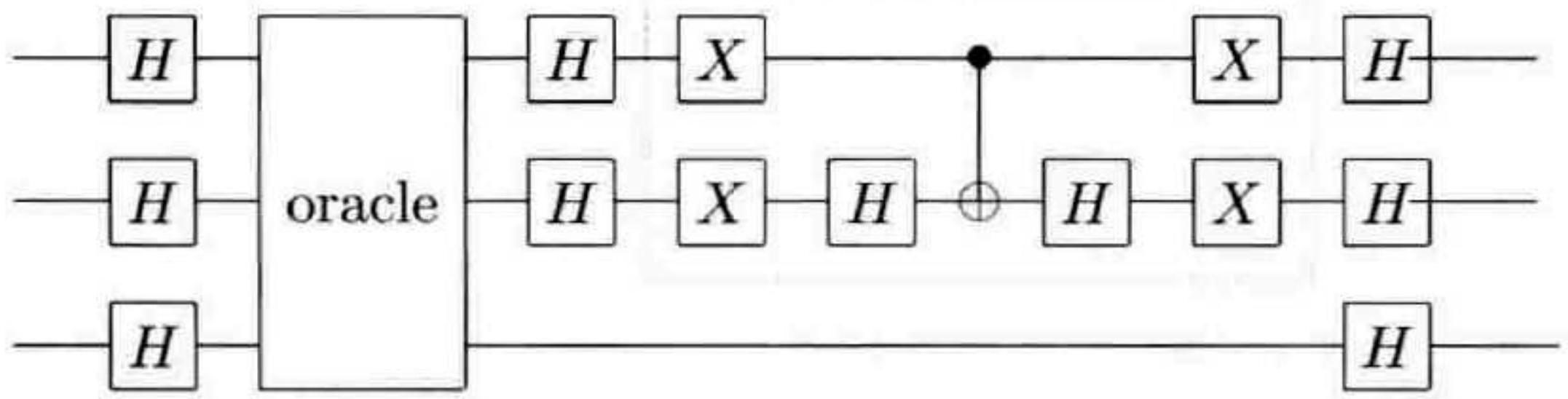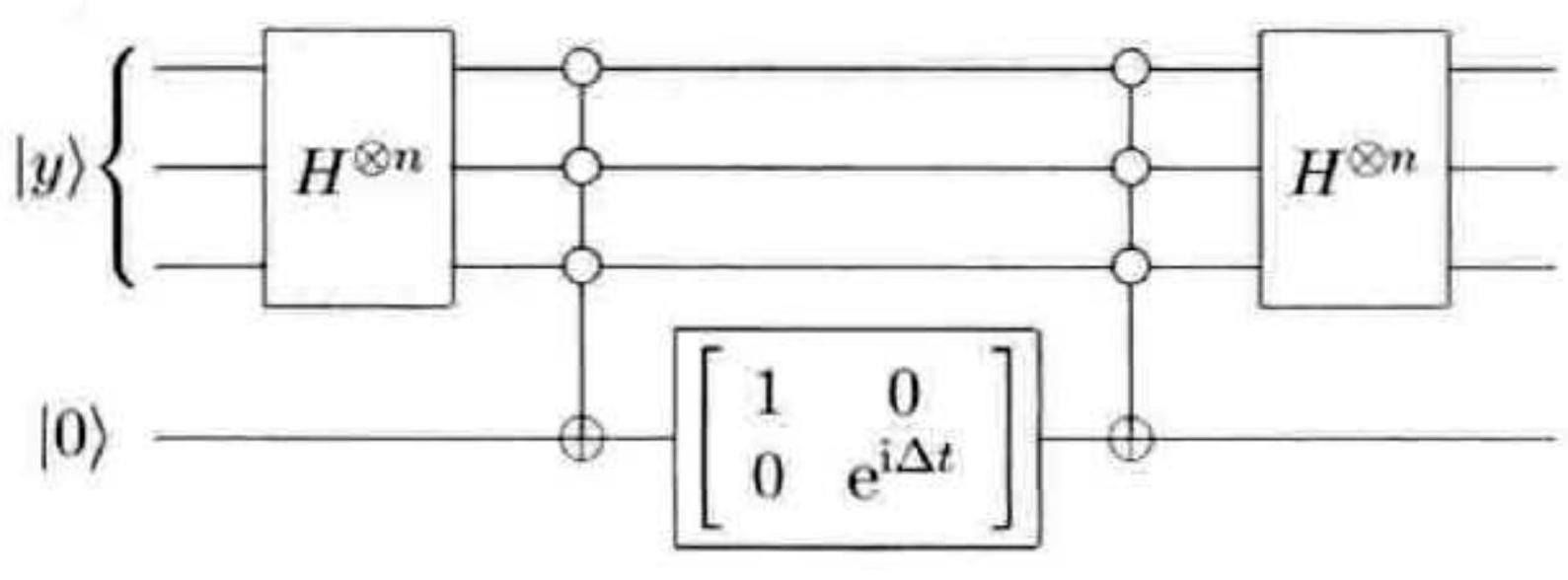 Grover 迭代中的每个操作都可以在量子计算机上有效实现。步骤 2 和步骤 4 的阿达玛变换各需要 $n=\log (N)$ 次操作。步骤 3 的条件相位偏移,可以通过 4.3 节的技术,使用 $O(n)$ 个门实现。 oracle 调用的代价取决于具体的应用;目前,Grover 迭代只需要单次 oracle 调用。注意到步骤2, 3 和 4 组合在一起的效果为