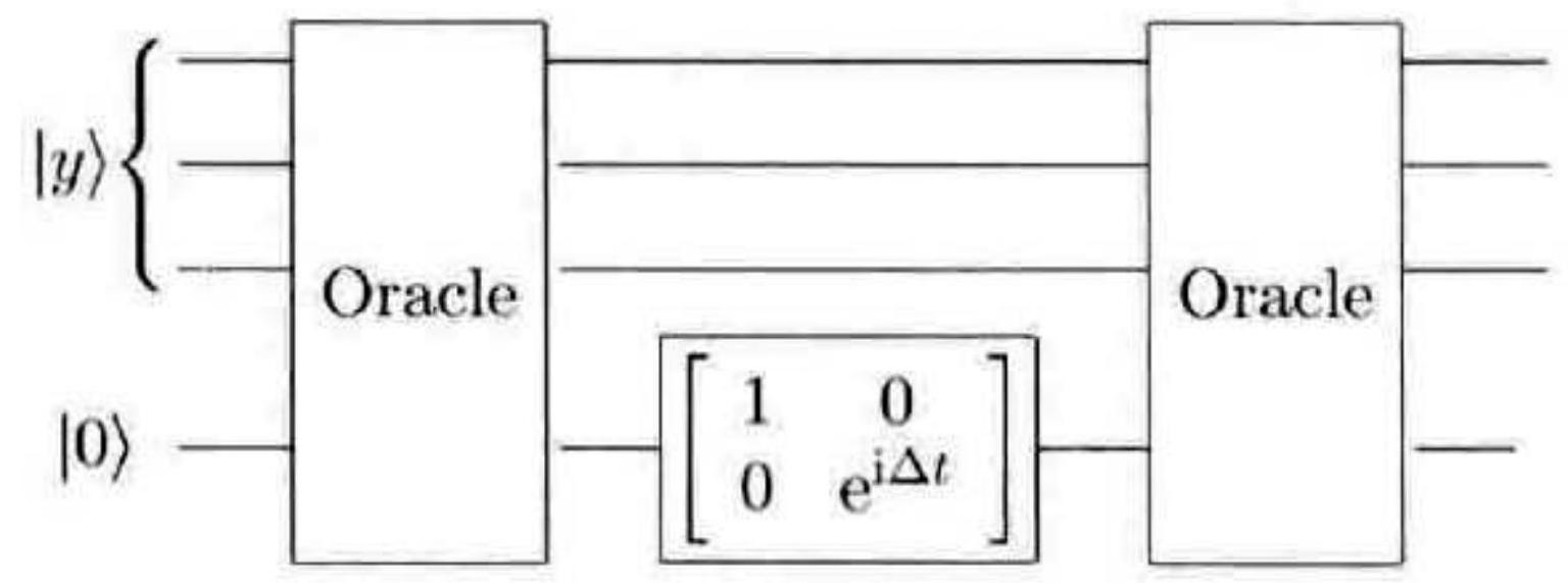 图 6-4 用两次 oracle 调用,实现操作 $\exp (-\mathrm{i}|x\rangle\langle x| \Delta T)$ 的电路