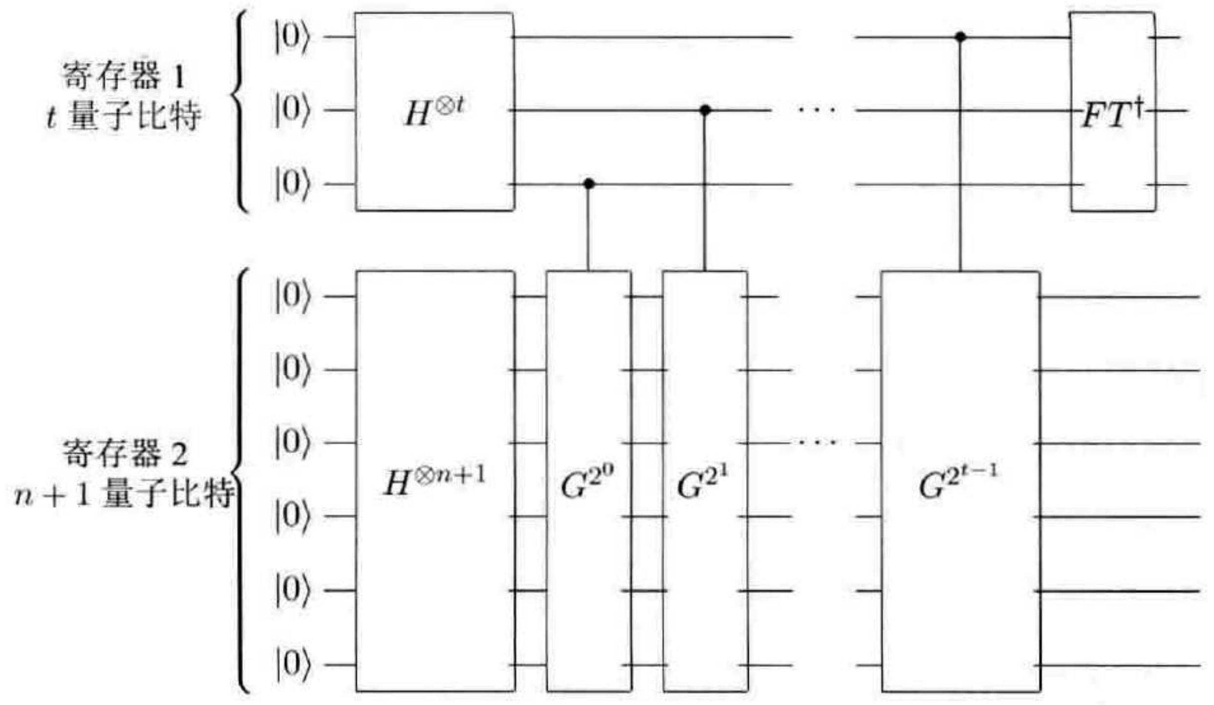 量子计算机上对应的算法效率如何呢?再者,尽管量子加速是可能的,这样的算法有多少用处呢?我们先阐明加速是可能的,然后再回到算法用途的问题。假设我们的量子计算机包含两个单元,CPU 和内存,就像经典计算机一样。设 CPU 含 4 个寄存器:(1)一个初始化为 $|0\rangle$ 的 $n$ 量子比特的"索引寄存器";(2)一个初始化为 $|s\rangle$ 的 $l$ 量子比特的寄存器,并且在整个计算中维持这个态;(3)一个初始化为 $|0\rangle$ 的 $l$ 量子比特的"数据"寄存器;(4)一个初始化为 $(|0\rangle-|1\rangle) / \sqrt{2}$的 1 量子比特的寄存器。