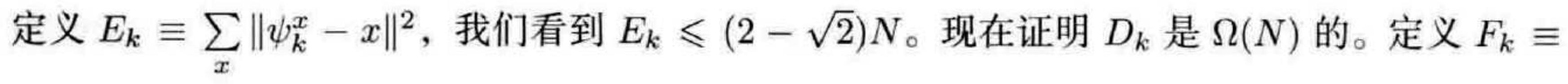 在习题 6.15 中将会证明 $F_{k} \geqslant 2 N-2\sqrt{N}$ 。再结合 $E_{k} \leqslant(2-\sqrt{2}) N$ 可以得到 $D_{k} \geqslant c N$ 对于足够大的 $N$ 成立,$c$ 是不超过 $(\sqrt{2}-\sqrt{2-\sqrt{2}})^{2} \approx 0.42$ 的常量。因为 $D_{k} \leqslant 4 k^{2}$ ,这表明