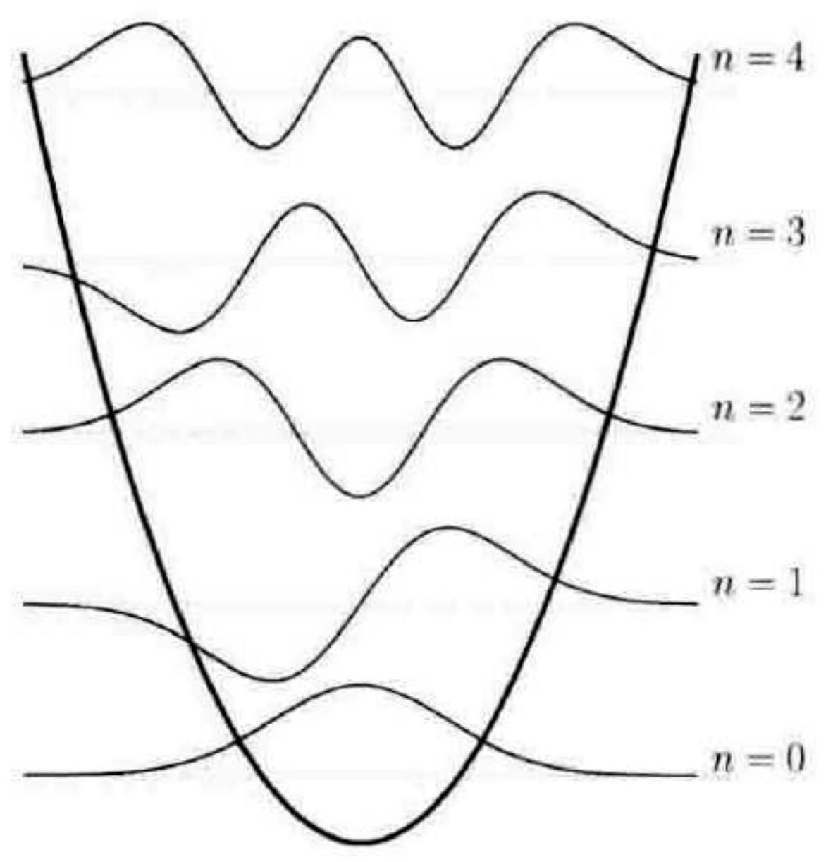 一个简谐振子的例子是处于抛物线势阱 $V(x)=m \omega^{2} x^{2} / 2$ 中的一个粒子。在经典世界,这就是一个弹簧上的方块。它会往返振动,同时其能量在弹簧与方块动能之间转换。它也可以是一个共振电路,其能量在电感与电容之间来回晃动。在这些系统中,系统的总能量是一个连续参量。