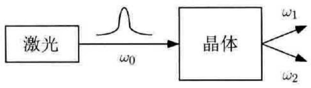 更好的同步可以利用参量下转换实现。这意味着把频率为 $\omega_{0}$ 的光子送人非线性光学介质比如 KH2PO4,用于产生光子对,其频率满足 $\omega_{1}+\omega_{2}=\omega_{0}$ 。动量也需要守恒,即为 $\vec{k}_{1}+\vec{k}_{2}=\vec{k}_{3}$ 。因此当一个频率 $\omega_{2}$ 的光子被(破坏性地)探测到时,另一个频率 $\omega_{2}$ 的光子也就被知道是存在的 (图7-2)。把这与逻辑门结合起来,只有当一个单光子(而不是两个或多个)被探测到时逻辑门才打开,同时适当地延迟多个下转换光源的输出,人们原则上可以获得在传输时间上同步的多个单光子,同步精度取决于探测器与逻辑门的分辨率。