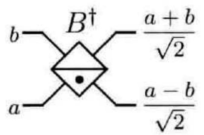 习题 7.9 (光学阿达玛门)证明下面的电路在双轨表示单光子态上实现阿达玛门,也就是 $|01\rangle \rightarrow(|01\rangle+|10\rangle / \sqrt{2})$ ,以及 $|10\rangle \rightarrow(|01\rangle-|10\rangle) \sqrt{2}$ ,再加一个整体相位。