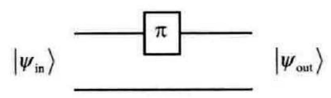 $$ \left|\psi_{\text {out }}\right\rangle=\left[\begin{array}{cc} \mathrm{e}^{\mathrm{i} \pi} & 0 \tag{7.23}\\ 0 & 1 \end{array}\right]\left|\psi_{\text {in }}\right\rangle $$