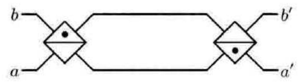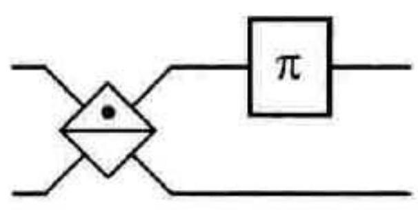 我们令上面的线代表 $|01\rangle$ 模,下面的线代表 $|10\rangle$ 模,而方框内的 $\pi$ 代表相位移动 $\pi \circ$