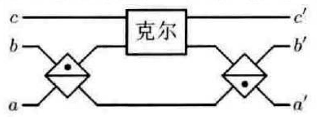其中 $H$ 是单量子比特阿达玛变换(用分束器与相移器很容易即可实现),而 $K$ 是我们刚考虑过的克尔相互作用,选取 $\chi L=\pi_{\circ}$ 。在构建可逆的经典光学逻辑门时,这种装置以前曾被讨论过,如专题 7.4 所示,在单光子区域,它也能起到量子逻辑门的功能。
