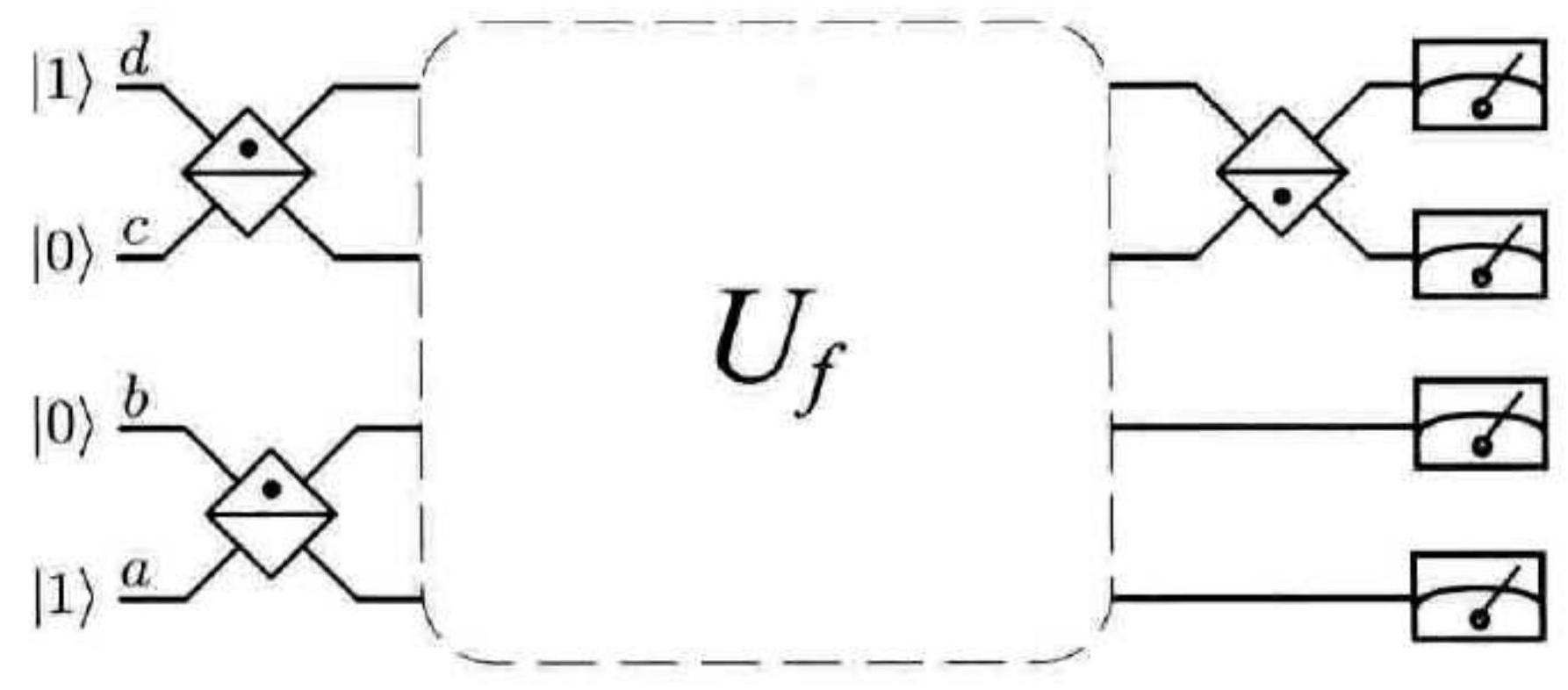 习题7.13(光学 Deutsch-Jozsa 量子电路)在1.4.4节,我们描述了一个量子电路,用于解决单比特 Deutsch-Jozsa 问题。用分束器,相移器和非线性克尔介质实现的此电路的单光子态版本 (基于双轨表示)如下:
