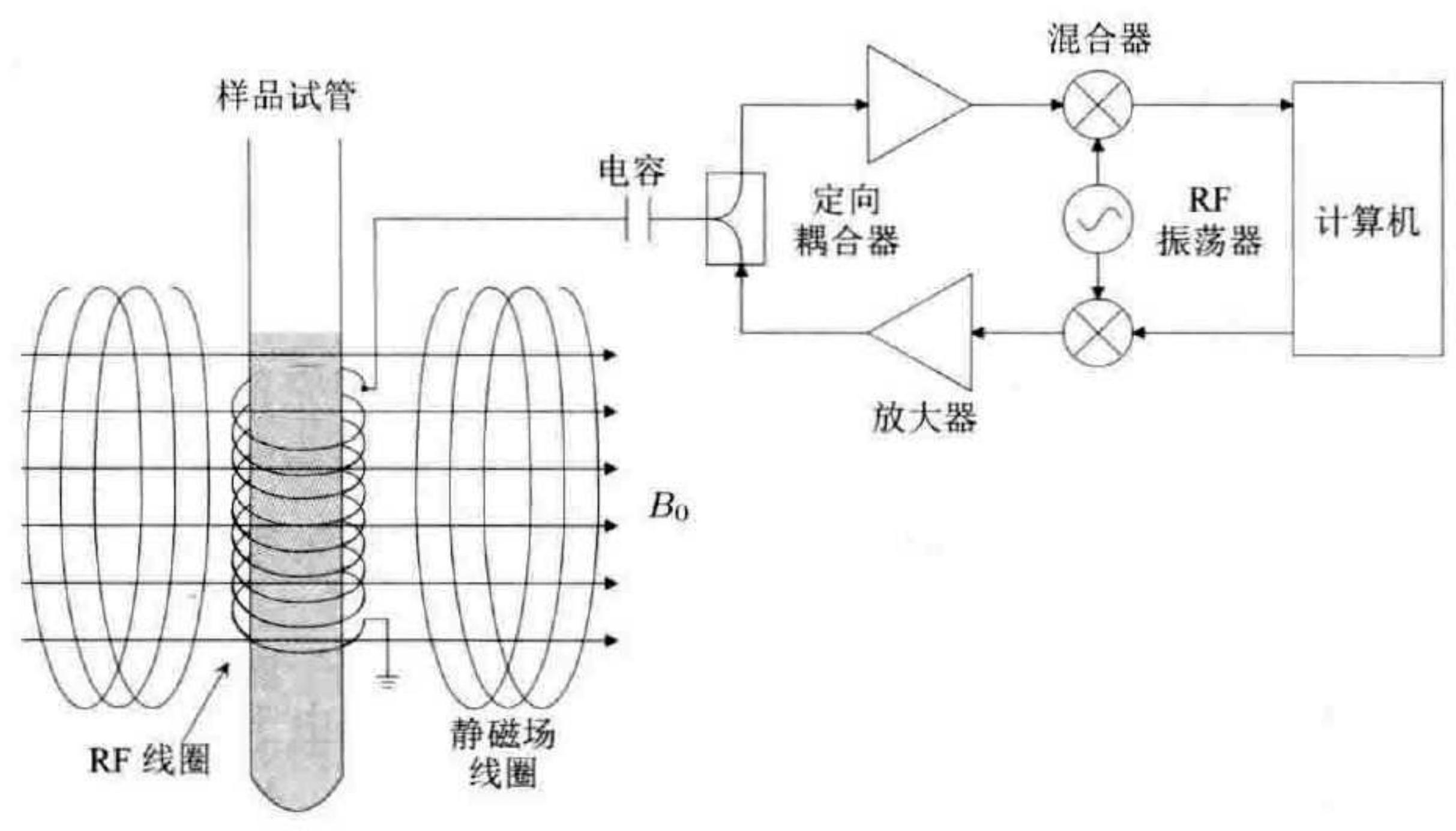 让我们先从装置的一般描述开始,它的运转方式随后将进行详细地数学建模。处理液态样品的脉冲式 NMR 系统的两个主要部分是样品与 NMR 谱仪,我们将会聚焦于此。能使用的一个典