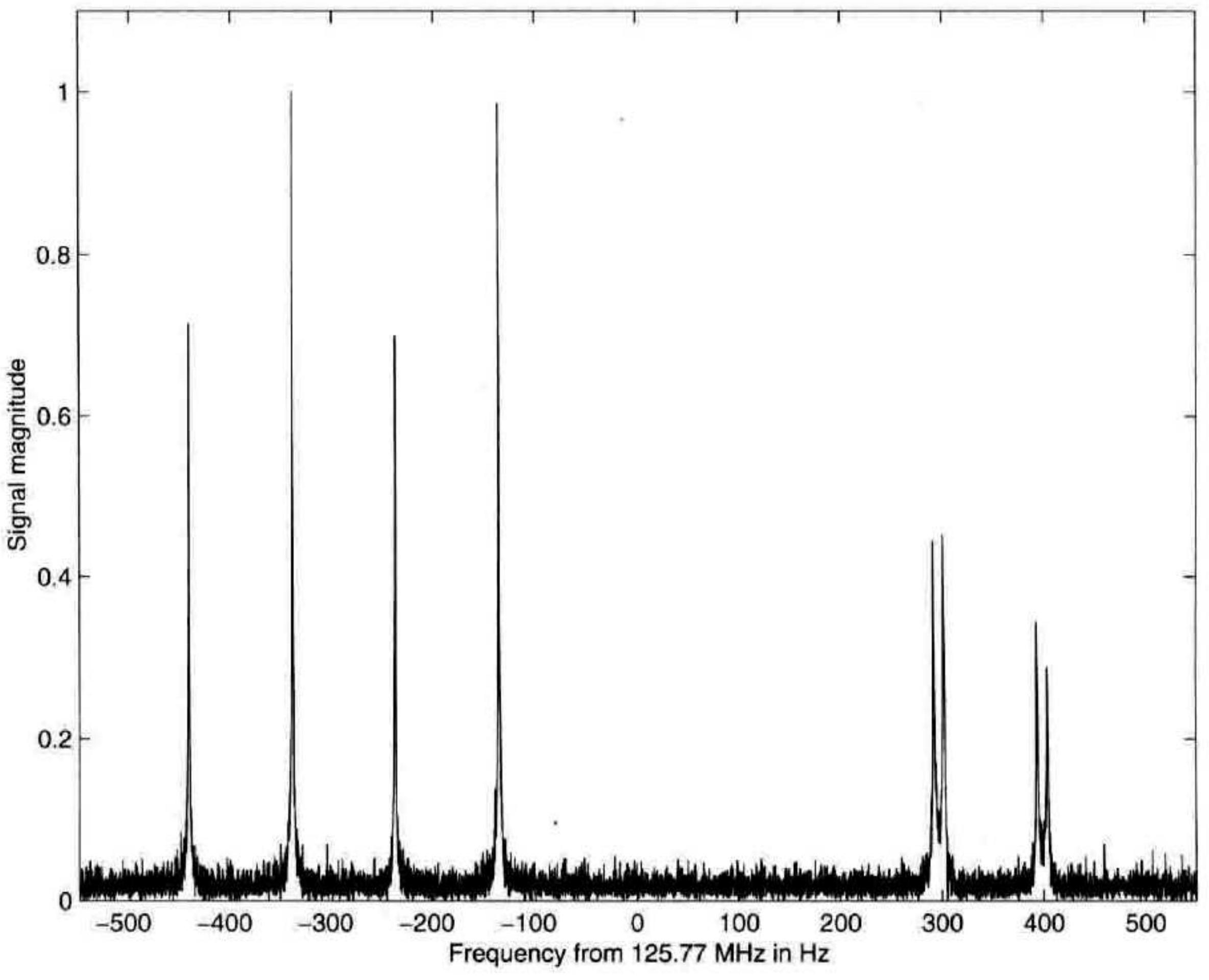一个典型的实验从长周期的等待开始,这样原子核才会热化到平衡态;这对一个配好的液体样品来说有可能需要好几分钟。在一个(经典)计算机的控制下,然后会加上 RF 脉冲来影响原子核的状态产生所需要的变换。高功率放大器接下来会很快地关闭,然后一个敏感的预放大器打开,用于测量自旋的末态。这个输出,被称为自由感应衰减,是傅里叶变换后得到的一个频域谱,其中峰的区域是自旋态的函数(图7-17)。