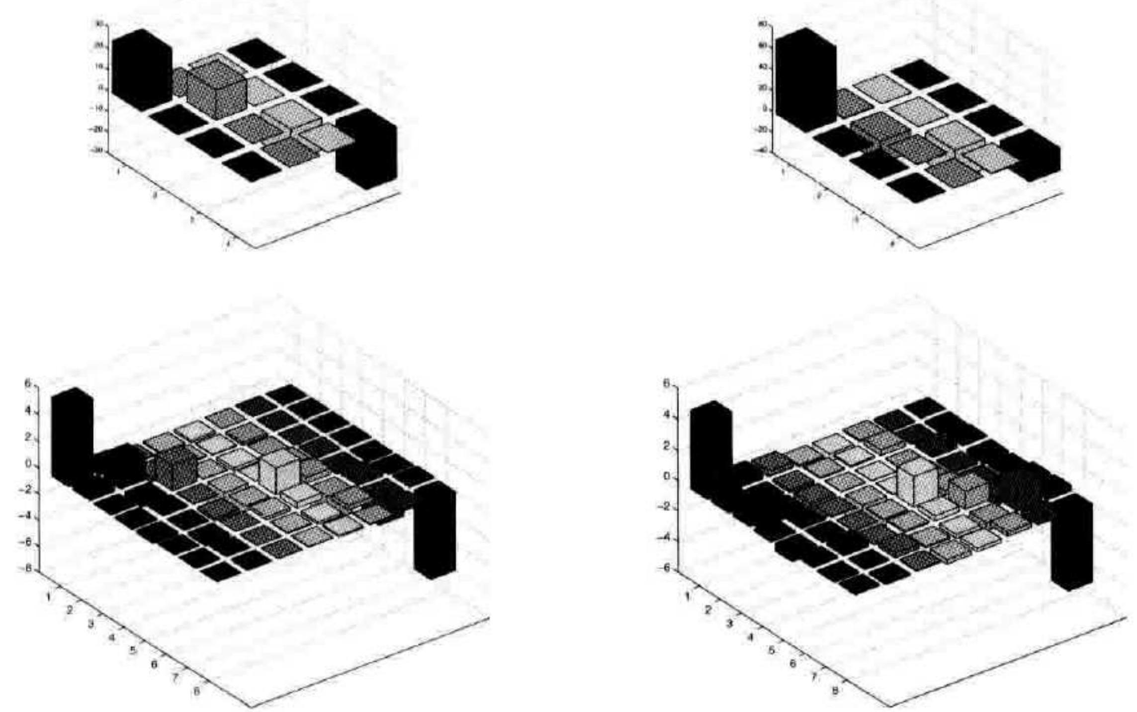 图 7-18 实验测量的偏差密度矩阵。垂直尺度是任意的,且只有实部显示出来;所有的虚部都相对很小。(左上)在 11.78 T 磁场下,氯仿分子 $\left({ }^{13} \mathrm{CHCl}_{3}\right)$ 的质子与碳原子核代表的两个量子比特的热平衡态。将 0.5 毫升, 200 毫摩尔的样品在丙酮-$d_{6}$ 中稀释,脱气,并用火焰密封在 5 毫米溥壁玻璃管中。(右上)在氯仿中用时间标记创建的两量子比特有效纯态,如式(7.161)。(左下)三氟乙烯中 3 个氟原子核的三量子比特热平衡态。(右下)使用逻辑标记从 3 个自旋系统创建的有效纯态,如式(7.164)所示
