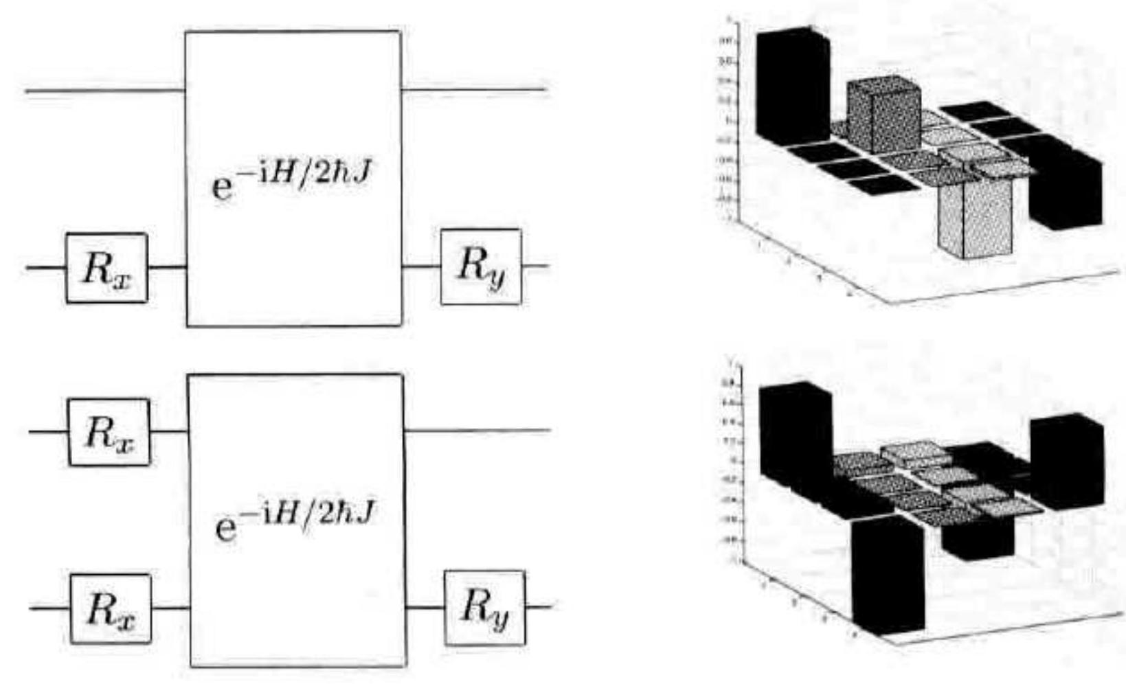 图 7-19 用 NMR 实施的量子电路,和实验上测量输出的偏差密度矩阵的实部。在这些电路中,$R_{x}$ 和 $R_{y}$代表单量子比特门,在 $\hat{x}$ 和 $\hat{y}$ 方向上产生 $90^{\circ}$ 旋转,通过大约 10 毫秒的 RF 脉冲实现,而含有两量子比特的方框 $\mathrm{e}^{-\mathrm{i} H / 2 \hbar J}$ 是时间长为 $1 / 2 J \approx 2.3$ 毫秒的自由演化。(上图)受控非电路,以及对一个热态输人的输出测量,展示了 $|10\rangle$ 和 $|01\rangle$ 对角元的交换,正如经典受控非门真值表所预计的那样。(下图)当 $|00\rangle$ 有效初态被制备出来作为输人时,产生贝尔态 $(|00\rangle-|11\rangle) / \sqrt{2}$ 的电路,以及它的输出结果
