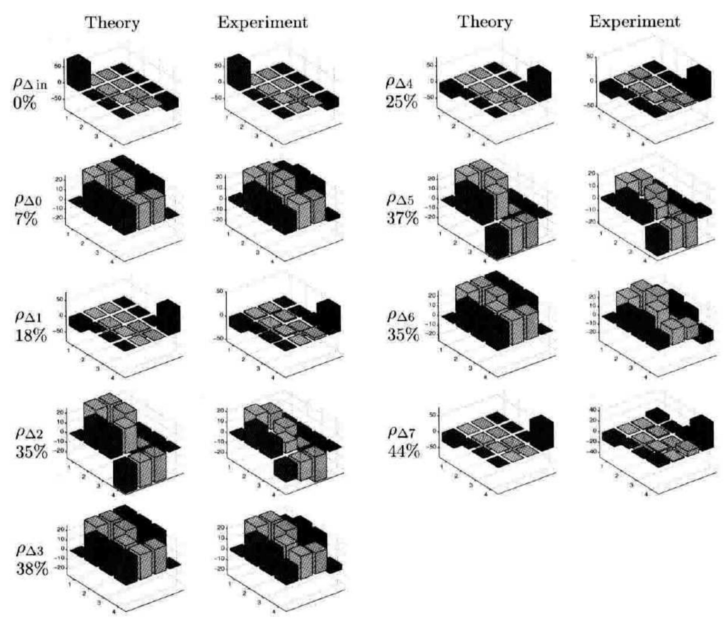 图 7-20 展示了对 $U$ 的最初 7 次迭代后,理论上的和测量出的偏差密度矩阵 $\rho_{\Delta n}=\left|\psi_{n}\right\rangle\left\langle\psi_{n}\right|-$ $\operatorname{tr}\left(\left|\psi_{n}\right\rangle\left\langle\psi_{n}\right|\right) / 4$ 。如预计的那样,$\rho_{\Delta 1}$ 清晰地揭示了对应于 $x_{0}=3$ 的 $|11\rangle$ 态。得到的模拟结果用于 $x_{0}$ 其他可能值的重复实验。测量每个密度矩阵需要 $9 \times 3=27$ 次重复实验, 9 代表层析重构,而 3 对应于纯态制备。