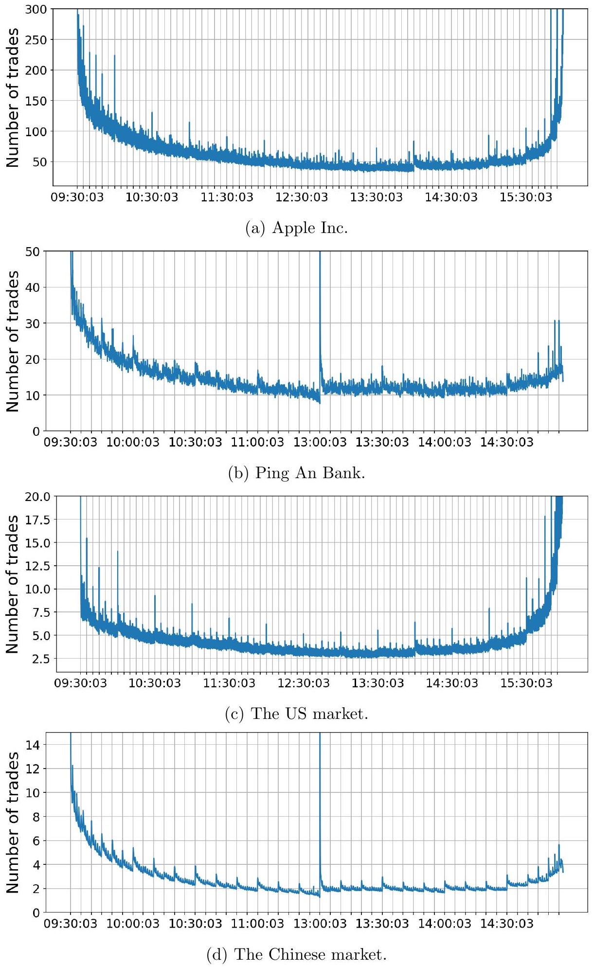 附录 B 中的表 A.1 提供了我们三秒日内交易量时间序列的汇总统计。平均而言,美国市场股票每三秒执行 4.38 笔交易,这比中国市场的笔数高出约 50%。此外,在跨股票和跨时间维度上,三秒窗口内的成交笔数存在巨大差异。