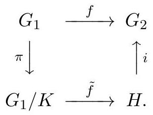 证明. We begin by trying to define the 函数 $\tilde{f}: G_{1} / K \rightarrow H$。Clearly, the only natural way to define $\tilde{f}$ on a 陪集 $g K$ is to set $\tilde{f}(g K)=f(g)$。In fact, this is also forced on us if we want $f=i \circ \tilde{f} \circ \pi$,because we must have $f(g)=i(\tilde{f}(\pi(g)))=i(\tilde{f}(g K))$,so $\tilde{f}(g K)=f(g)$。We must check that this is 良定义的,i.e. independent of the choice of 代表元 $g \in g K$。If instead we choose a different 代表元 of $g K$,necessarily of the form $g k$,then $f(g k)=f(g) f(k)=f(g) \cdot 1=f(g)$,hence $\tilde{f}$ is 良定义的,and its values $\tilde{f}(g K)=f(g)$ lie in $H=\operatorname{Im} f$。So we can view $\tilde{f}$ as a 函数 $G_{1} / K \rightarrow H$,and it is clearly 满射。Moreover, $\tilde{f}$ is a 同态 since