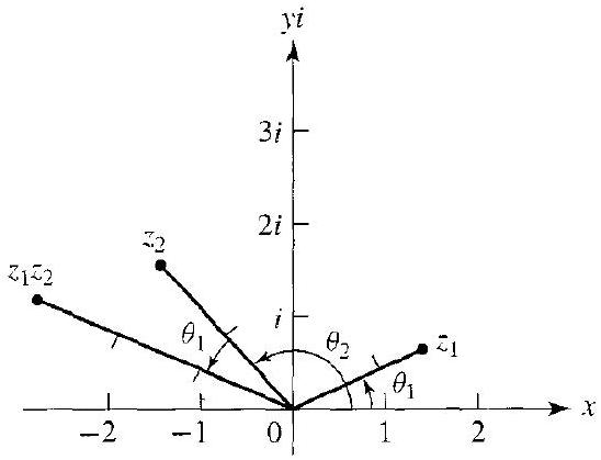 \begin{align*} z_{1} z_{2} & =\left|z_{1}\right| e^{i \theta_{1}}\left|z_{2}\right| e^{i \theta_{2}}=\left|z_{1}\right|\left|z_{2}\right| e^{i\left(\theta_{1}+\theta_{2}\right)} \\ & =\left|z_{1}\right|\left|z_{2}\right|\left[\cos \left(\theta_{1}+\theta_{2}\right)+i \sin \left(\theta_{1}+\theta_{2}\right)\right] \tag{5} \end{align*}