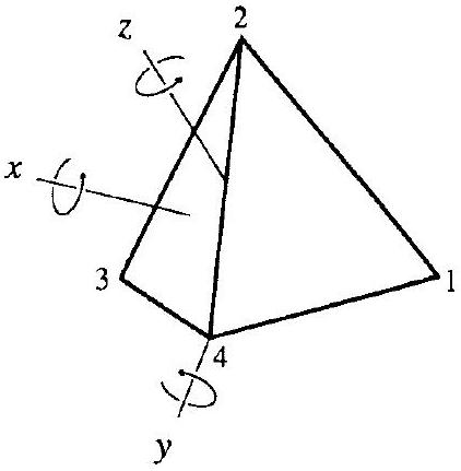 示例 7.10.7 在正四面体的旋转对称四面体群 $T$ 中,设 $x$ 和 $y$ 分别表示绕一个面中心和一个顶点的 $2 \pi / 3$ 旋转,设 $z$ 表示绕一条边中心的 $\pi$ 旋转,如下图所示。顶点按图中所示编号, $x$ 在顶点上的作用是置换 (234), $y$ 的作用是 (123), $z$ 的作用是 (13)(24)。计算这些置换的乘积表明 $x y z$ 在顶点上是平凡作用。由于唯一固定所有顶点的等距变换是恒等,所以 $x y z=1$。