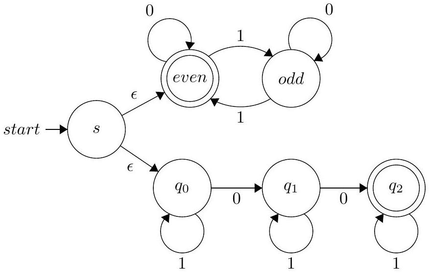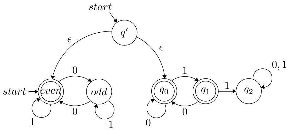 - 从新的起始状态 $q_0$ 添加 $\epsilon$-转移(空转移)到原来两个自动机的起始状态,即 $c_0$ 和 $p_0$。
