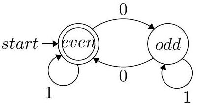 - 状态 $p_1$:表示到目前为止有奇数个 1。这不是一个接受状态。如果读到 0,状态不变。如果读到 1,1 的数量变为偶数,转移回 $p_0$。