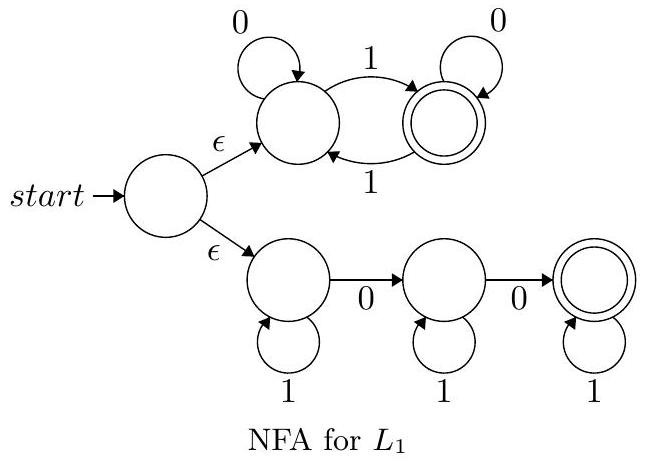 这个问题要求我们构造一个 NFA,它接受的语言 $L$ 包含两类字符串:要么字符串中恰好有两个 0,要么字符串中有偶数个 1。