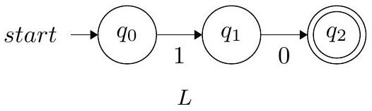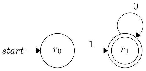 - 解答的图示简化了这个过程,直接画出:$p_0 \xrightarrow{1} p_1$,然后 $p_1$ 上有一个 '0' 的自循环。这在直觉上更简单,也是对 0* 的一种有效表达。所以得到 $p_0 \xrightarrow{1} p_1(\text{自循环}0)$,$p_1$ 是接受。