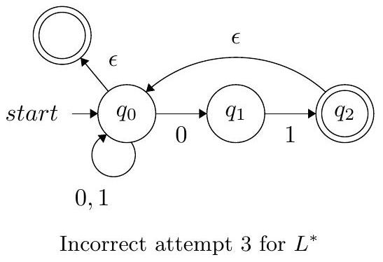 - 解答中的图示采用了另一种等价的星号构造方法:(1) 添加新起始/接受状态 $s$ (2) 添加 $s \xrightarrow{\epsilon} q_0$ (3) 添加 $q_2 \xrightarrow{\epsilon} s$ (4) 添加 $q_2 \xrightarrow{\epsilon} q_0$ 的返回边和 $s$ 成为接受状态。解答中的图更复杂,但核心思想都是为了实现“0次或多次重复”。