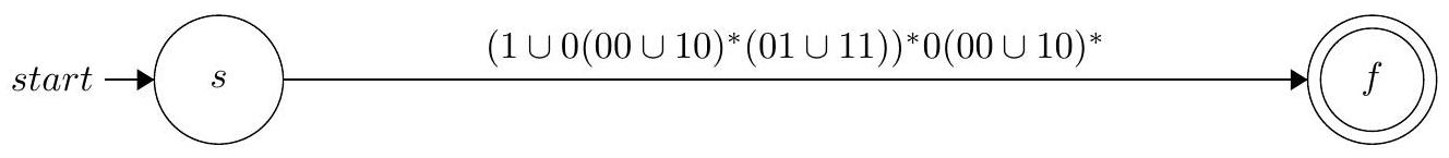 从开始到结束状态的正则表达式是 $\left(1 \cup 0(00 \cup 10)^{*}(01 \cup 11)\right)^{*} 0(00 \cup 10)^{*}$