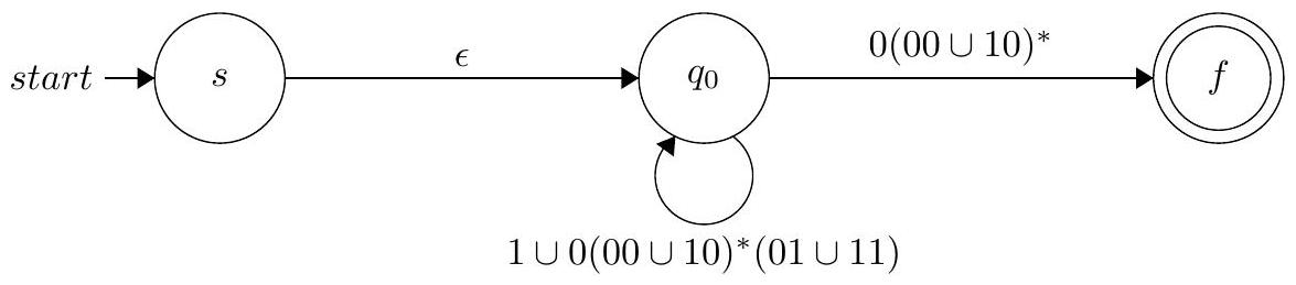 - $q_0$ 有一个自循环,标签为 $1 \cup 0(00 \cup 10)^*(01 \cup 11)$。