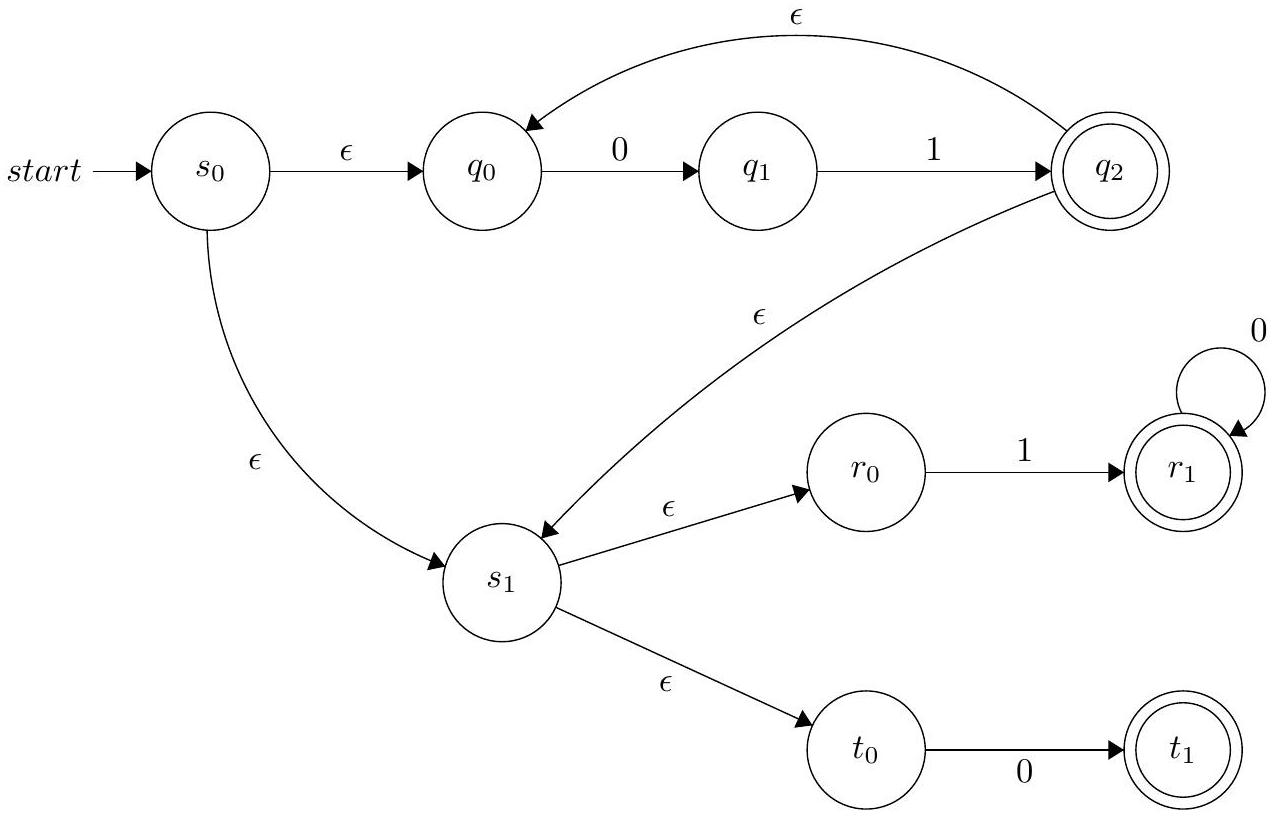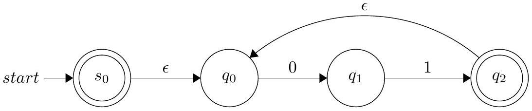 - 连接它们:从 $s_1$ (0的接受状态) 画 $\epsilon$-转移到 $s_2$ (1的起始状态),并取消 $s_1$ 的接受状态。最终得到 $s_0 \xrightarrow{0} s_1 \xrightarrow{\epsilon} s_2 \xrightarrow{1} s_3$。可以简化为 $q_0 \xrightarrow{0} q_1 \xrightarrow{1} q_2$。