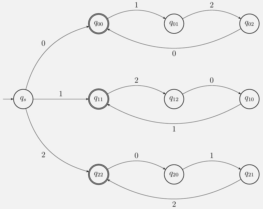 * 起始状态 $q_s$: 是接受状态,处理了空字符串 $\varepsilon$。