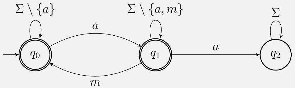 * NFA: $q_s \xrightarrow{a} q_{a,start} \xrightarrow{b} q_{a,start} \xrightarrow{a} q_{a,end}$。停在接受状态,接受。