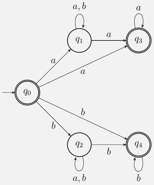 * 正则表达式 $\varepsilon \cup a \cup b \cup\left(a(a \cup b)^{*} a\right) \cup\left(b(a \cup b)^{*} b\right)$: