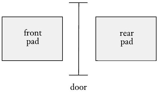 自动门的控制器就是此类设备的一个例子。自动门通常出现在超市入口和出口处,当控制器感应到有人靠近时,自动门就会自动打开。自动门前方有一个踏板,用于检测即将走过门口的人的存在。门后方还有一个踏板,以便控制器能让门开足够长的时间,让行人完全通过,同时也能防止门在开启时撞到站在后面的人。这种配置如下图所示。