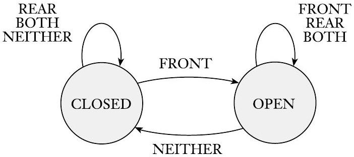 控制器根据其接收到的输入从一个状态转移到另一个状态。当处于 CLOSED 状态并接收到 NEITHER 或 REAR 输入时,它保持在 CLOSED 状态。此外,如果接收到 BOTH 输入,它仍然保持 CLOSED 状态,因为开门有撞倒后方踏板上的人的风险。但如果 FRONT 输入到达,它会转移到 OPEN 状态。在 OPEN 状态下,如果接收到 FRONT、REAR 或 BOTH 输入,它会保持在 OPEN 状态。如果 NEITHER 输入到达,它会返回到 CLOSED 状态。