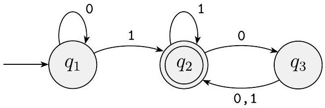 图 1.4 称为 $M_{1}$ 的状态图。它有三个状态,标记为 $q_{1}, q_{2}$ 和 $q_{3}$。起始状态 $q_{1}$ 由指向它的无源箭头表示。接受状态 $q_{2}$ 是双圆圈的那个。从一个状态到另一个状态的箭头称为转移。