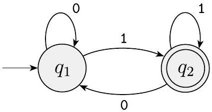 理解任何机器的一个好方法是尝试一些示例输入串。当您进行这些“实验”以查看机器如何工作时,其工作方式通常会变得明显。在示例串 1101 上,机器 $M_{2}$ 从其起始状态 $q_{1}$ 开始,读取第一个 1 后首先进入状态 $q_{2}$,然后读取 1、0 和 1 后进入状态 $q_{2}、q_{1}$ 和 $q_{2}$。该串被接受,因为 $q_{2}$ 是一个接受状态。但串 110 使 $M_{2}$ 停留在状态 $q_{1}$,因此被拒绝。在尝试更多例子后,您会发现 $M_{2}$ 接受所有以 1 结尾的串。因此 $L\left(M_{2}\right)=\{w \mid w \text { 以 1 结尾}\}$。
