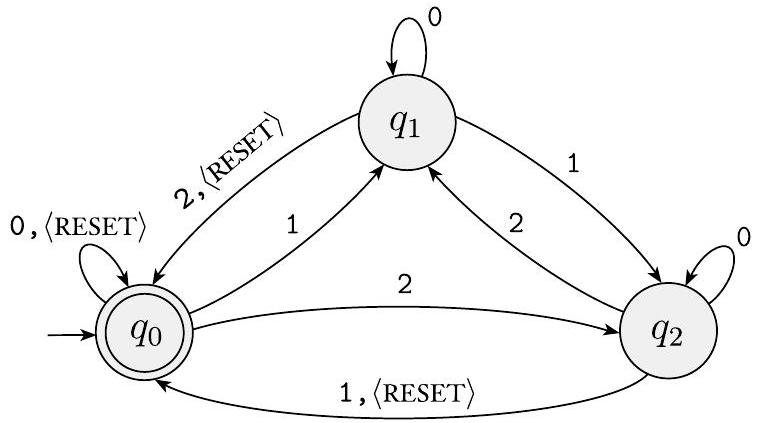 图 1.14 显示了三状态机器 $M_{5}$,它有一个四符号输入字母表,$\Sigma=\{\langle$ RESET $\rangle, 0,1,2\}$。我们将 $\langle$ RESET $\rangle$ 视为一个单一符号。