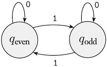接下来,您通过观察在读取符号后如何从一种可能性转移到另一种可能性来分配转移。因此,如果状态 $q_{\text {even }}$ 代表偶数可能性,状态 $q_{\text {odd }}$ 代表奇数可能性,您会将转移设置为在读取 1 时翻转状态,在读取 0 时保持不变,如下图所示。