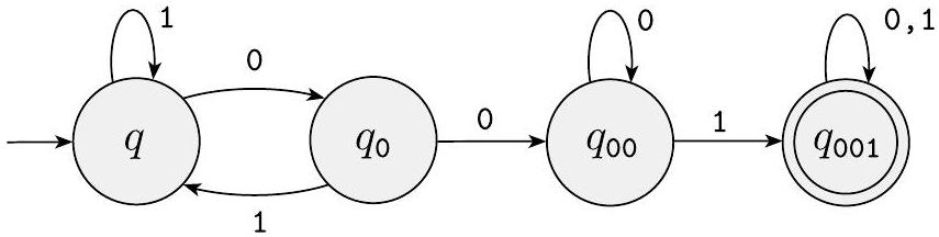 将状态 $q, q_{0}, q_{00}$ 和 $q_{001}$ 分配给这些可能性。您可以通过观察从 $q$ 读取 1 时保持在 $q$,但读取 0 时转移到 $q_{0}$ 来分配转移。在 $q_{0}$ 中读取 1 时返回到 $q$,但读取 0 时转移到 $q_{00}$。在 $q_{00}$ 中读取 1 时转移到 $q_{001}$,但读取 0 时保持在 $q_{00}$。最后,在 $q_{001}$ 中读取 0 或 1 时保持在 $q_{001}$。起始状态是 $q$,唯一接受状态是 $q_{001}$,如图 1.22所示。